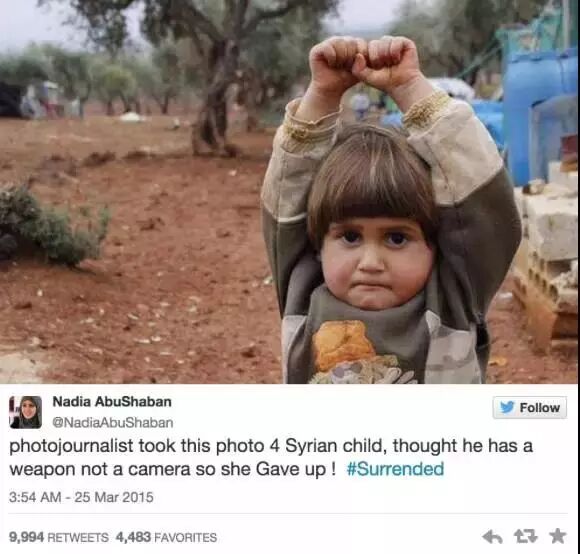 难民营中4岁的Hudea,面对摄影师的长焦镜头,认为那是一把枪,紧咬嘴唇的她,面对镜头举起双手投降。