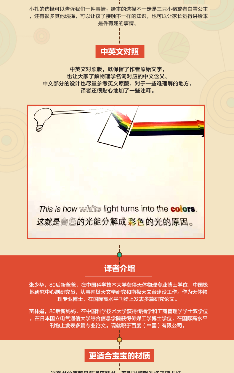 在我们的公众号上介绍这套绘本的文章一晚上获得了100000+的阅读量。这样高的关注度当然不是因为爸爸妈妈都想培养孩子做理论物理学家。这套特别的绘本用简单清晰、色彩鲜明的图文,描述了这个世界的基本运行规律——物理学的知识。物理没那么恐怖,用对了方法,物理学世界也会很可爱,像漂亮的动物、汽车或水果一样让宝宝爱不释手。