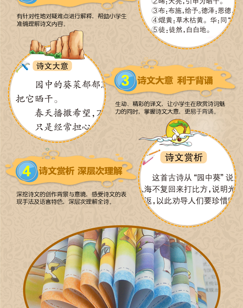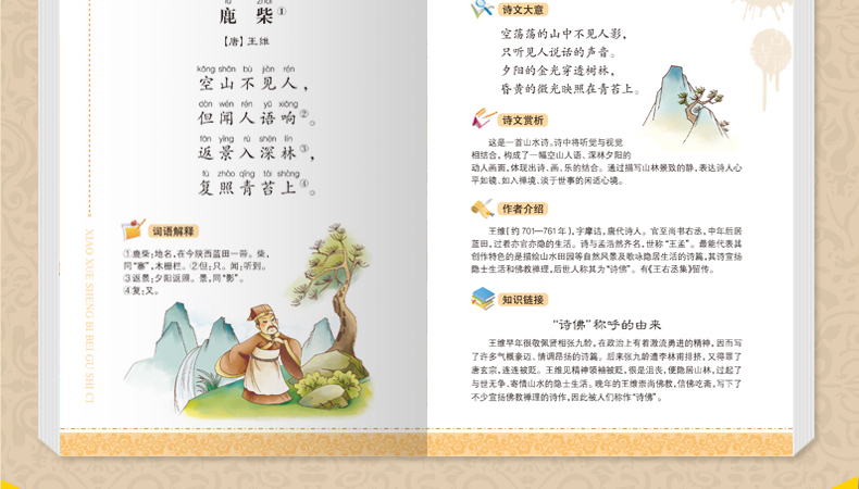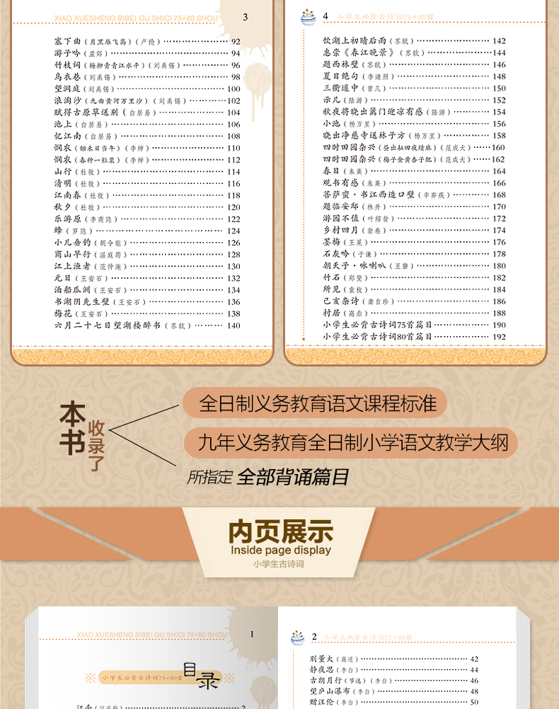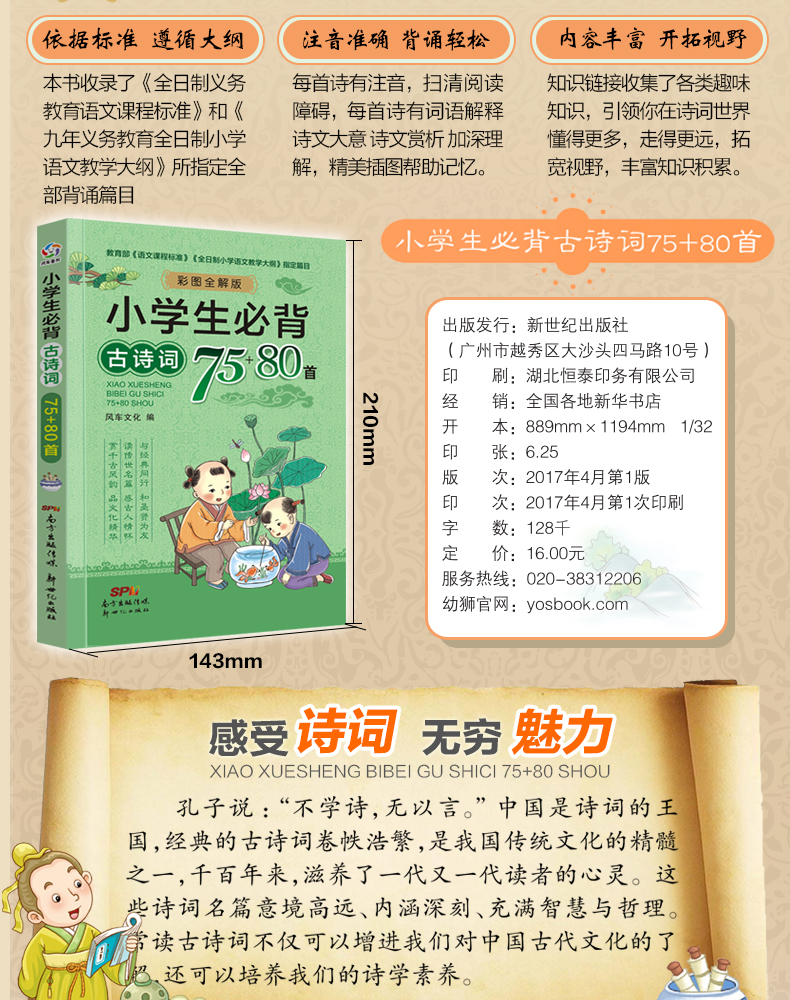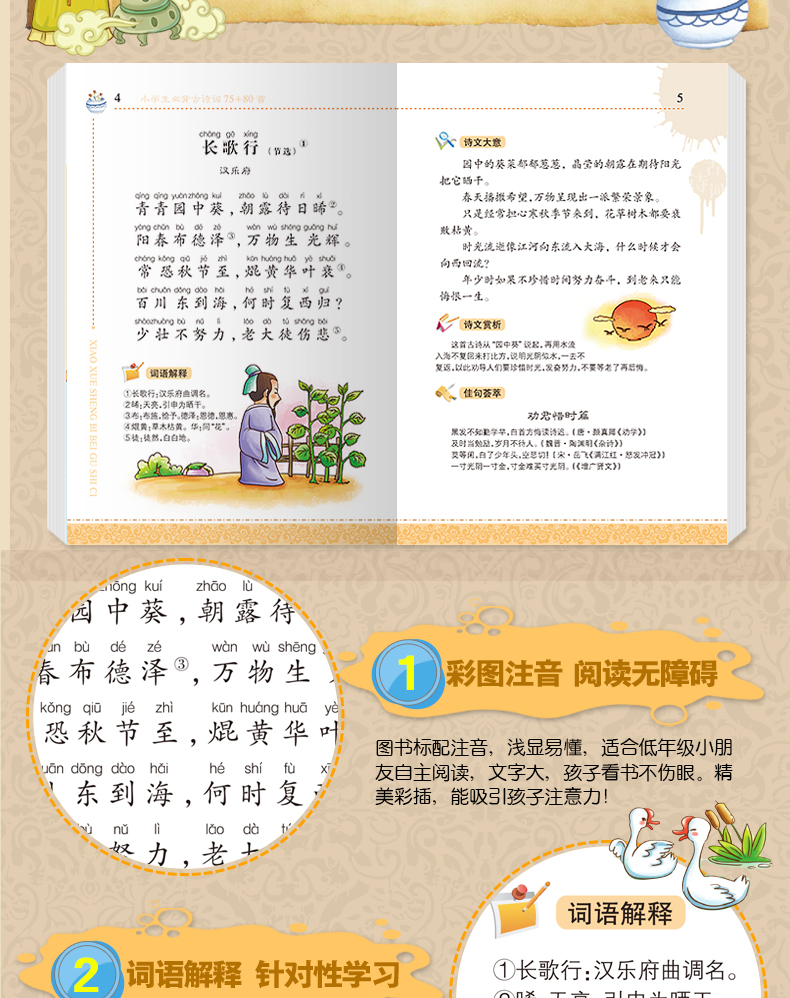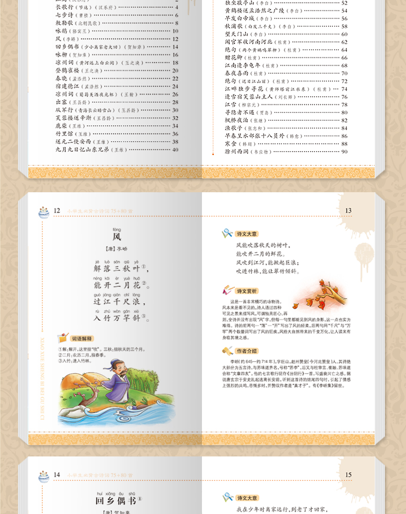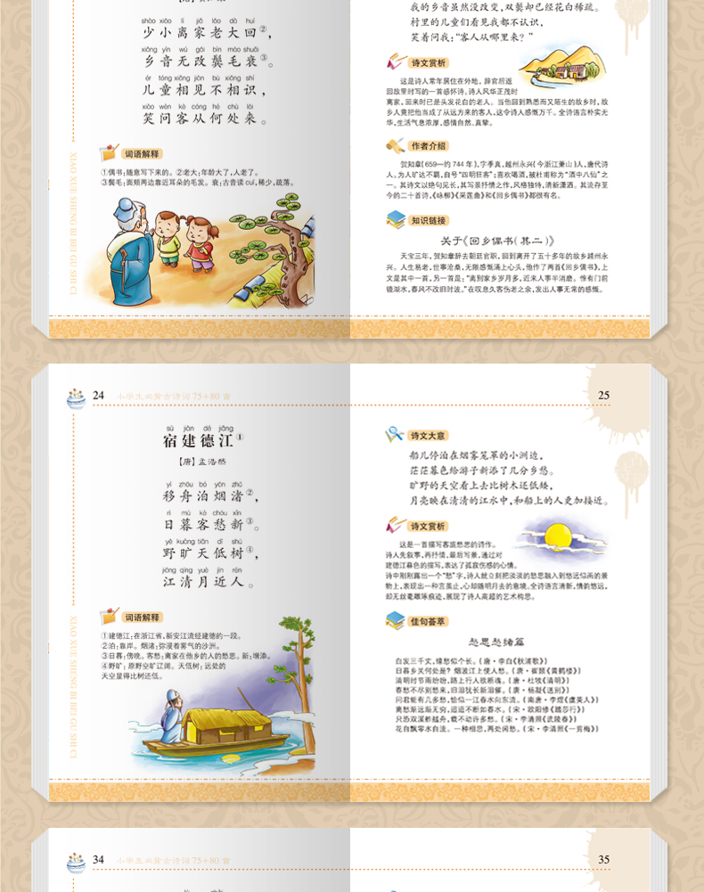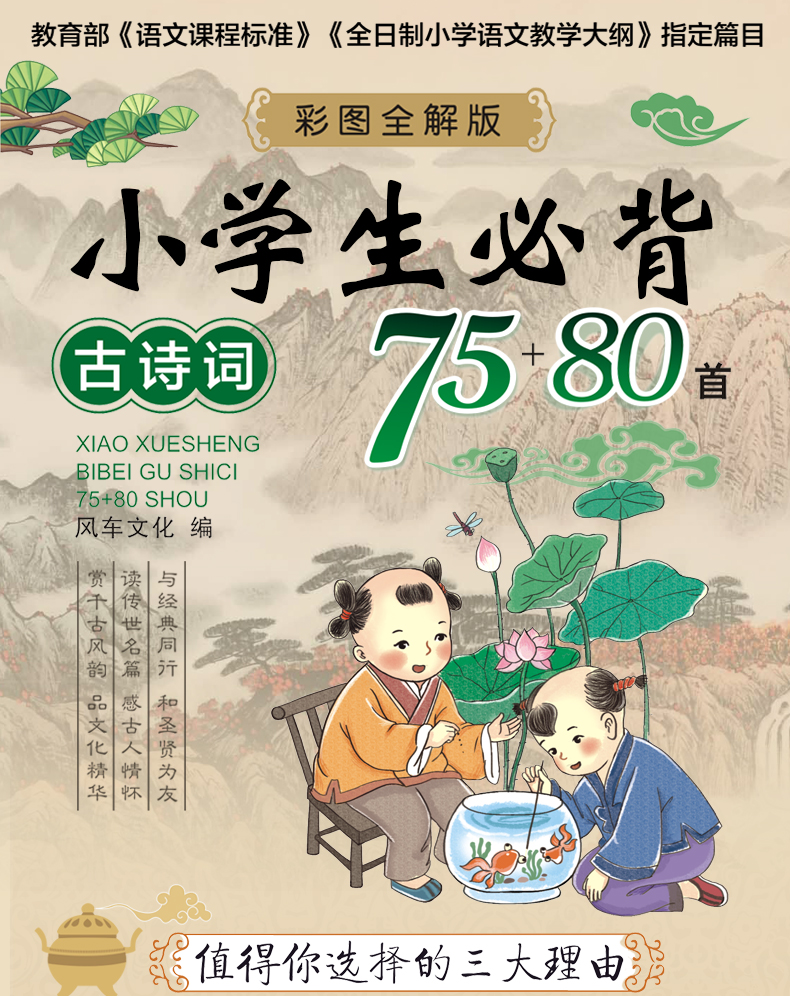 《小学生必背古诗词大全75首+80首PDF彩图注音版)》除给原文加注汉语拼音,以适合小学生朗读、背诵外,书中还设置了作者简介、重难点字词注释、原文翻译、原文赏析、拓展阅读等栏目,以期更好地帮助小学生理解诗词内容、体会诗词意境、品味诗词的不朽魅力。书中百余幅诗意贴切的优美插图表情迭意,使小学生学习起来轻松有趣,增加知识面的同时,更对古诗词和诗人加深了了解。