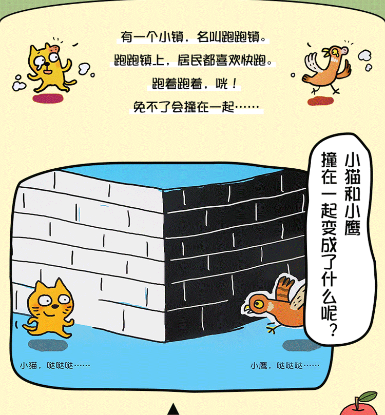 跑跑镇上的居民都喜欢快跑,快跑就免不了撞在一起:小猫和小鹰撞在一起出现了什么?苹果和红宝石撞在一起?全书充满生活中幽默诙谐的小情趣。故事有想象力,构思巧妙,以出人意料的结果,让人忍俊不禁。