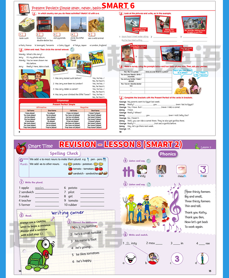 2. 语法知识点螺旋式重复:第二册有稍微超过一半的内容是巩固且拓展第一册所学的语法点,剩下的才是新语法点的介绍;第三册大部分内容是重复第一册和第二册所学内容,然后才是新添加的知识点,依次类推。虽然知识点是重复的,但是内容的深度确实逐渐上升的,这种编排方式,有利于孩子打下坚实的语法基础知识。