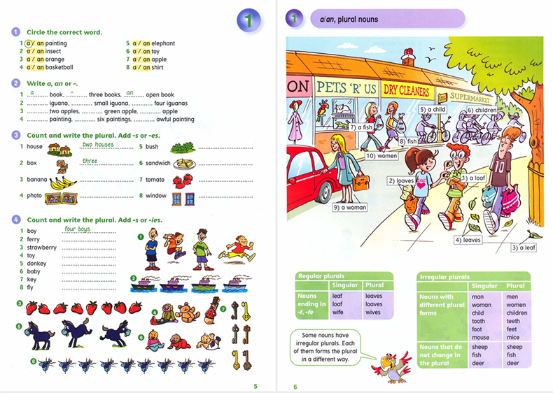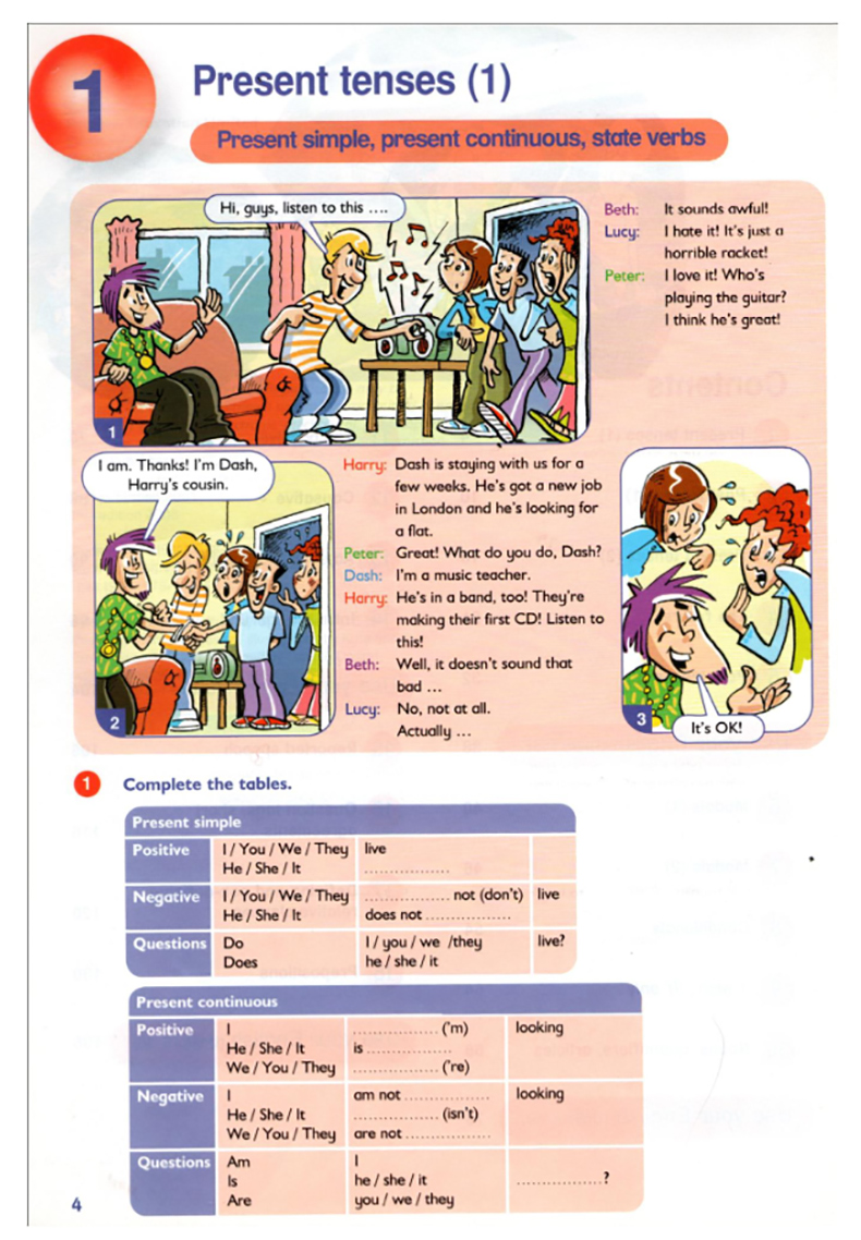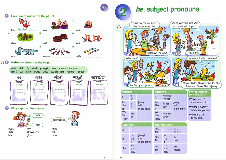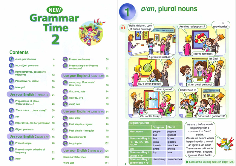 Grammar time和 New Grammar Time相较之前的那些教材,就更学术化些,这不仅体现在画面的趣味性上,还体现在练习题的多少上。这套书40%是知识点,60%是对知识点的习题,不过,每个知识点还是有个趣味性的短小插画故事,所以还是有些趣味性的。