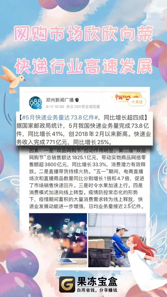 5月快递业务量达73.8亿件果冻宝盒背靠
