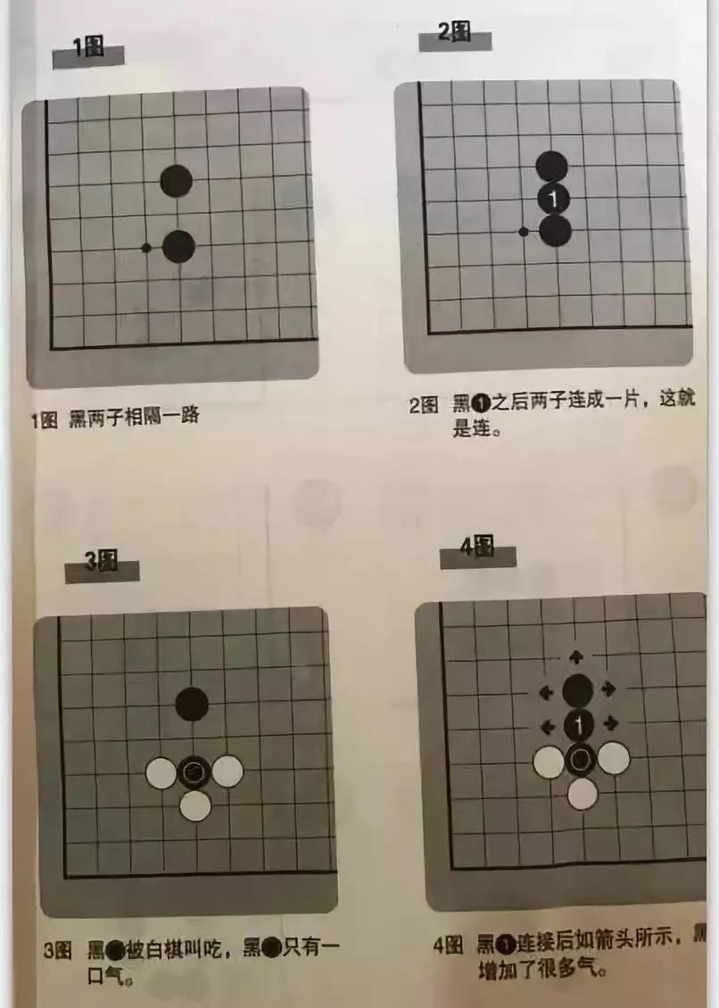 图3黑圆圈被白棋叫吃,黑圆圈只有一口气,图4黑1连接之后黑棋的气增多了。