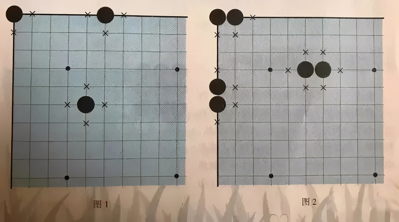 图1 图中四个棋形都是老虎口,白如果下到叉处,都只剩下一口气,就有被吃掉的危险。在棋盘中央三个棋子形成老虎口,在边上两颗棋子形成老虎口,角上一颗棋子形成老虎口。