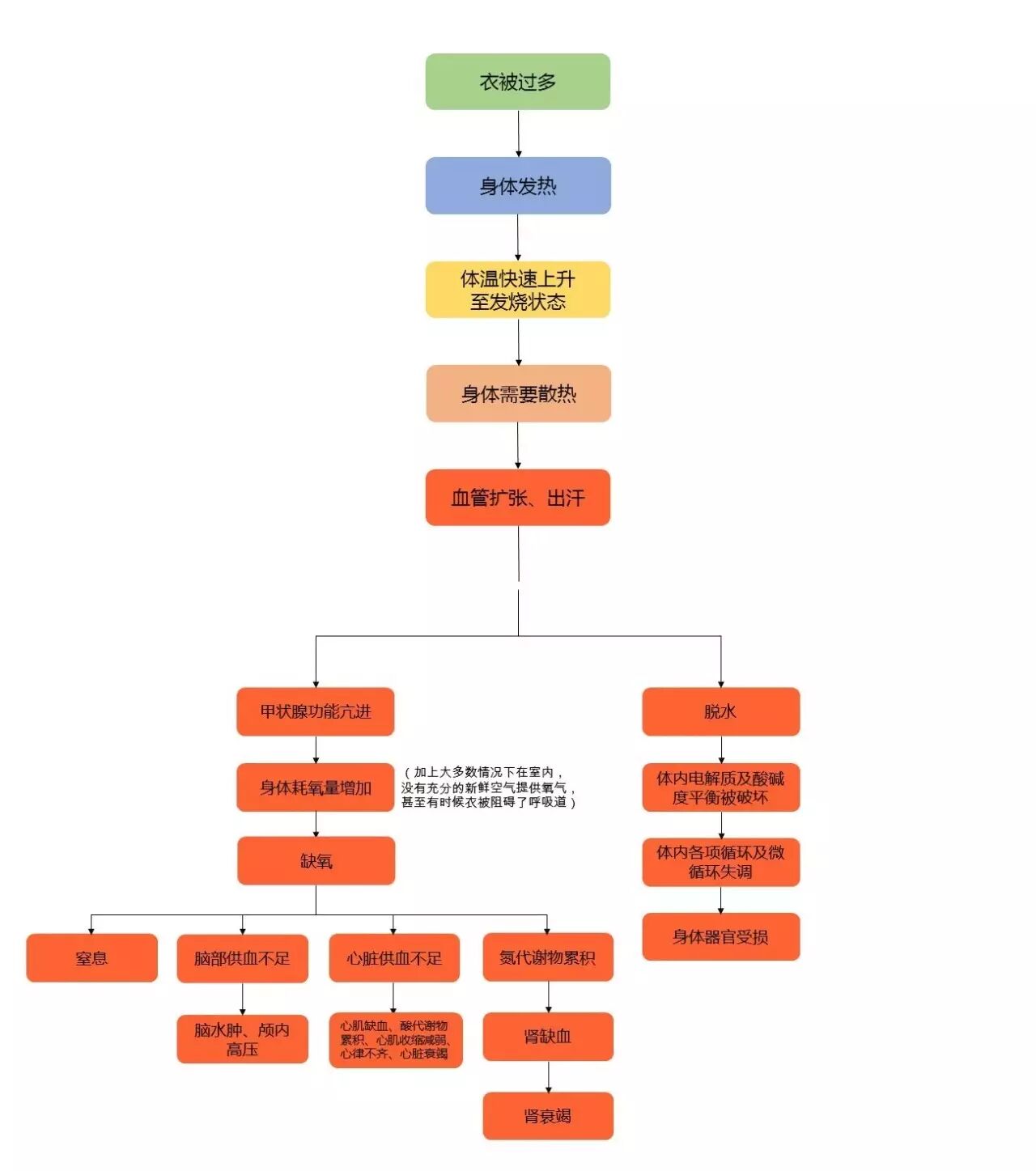 1岁以内的小婴儿是蒙被综合症的高发群体,因为他们的新陈代谢速度是成年人的2-3倍,可是稚嫩的身体还没有建立起足够成熟的温度调节机制,体内各器官的发育也不完善。可能对成年人来说是温暖,对他们来说就是致命的高温,我们决不能掉以轻心!